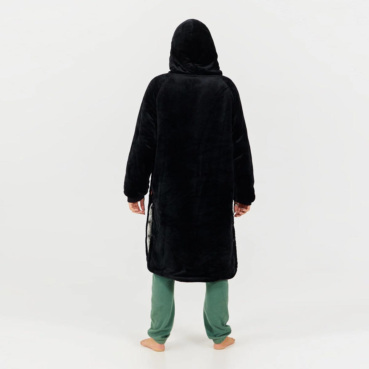 Comfortable and stylish, the Sofa Poncho was designed by the fireside. We wanted to create a garment for relaxing at home after an intense surf or snowboard session. With your hands tucked into the kangaroo pocket, its thick 100% recycled polyester fleece keeps you comfortably warm, while the adjustable hood and wide raglan sleeves offer complete freedom of movement. The side press-studs make it easy to slip on and also allow it to be used as a changing poncho. Perfect for cosy indoor comfort, its sublimated prints and embroidered logo give it a bold outdoor look, ideal for getting changed after a winter surf session or at the end of a day on the ski slopes.